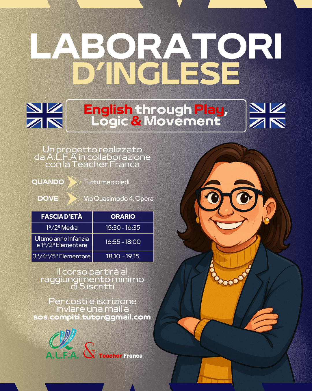 La grande novità sono i nuovi laboratori d’inglese per bambini e ragazzi, nati dalla collaborazione tra A.L.F.A. & Teacher Franca.